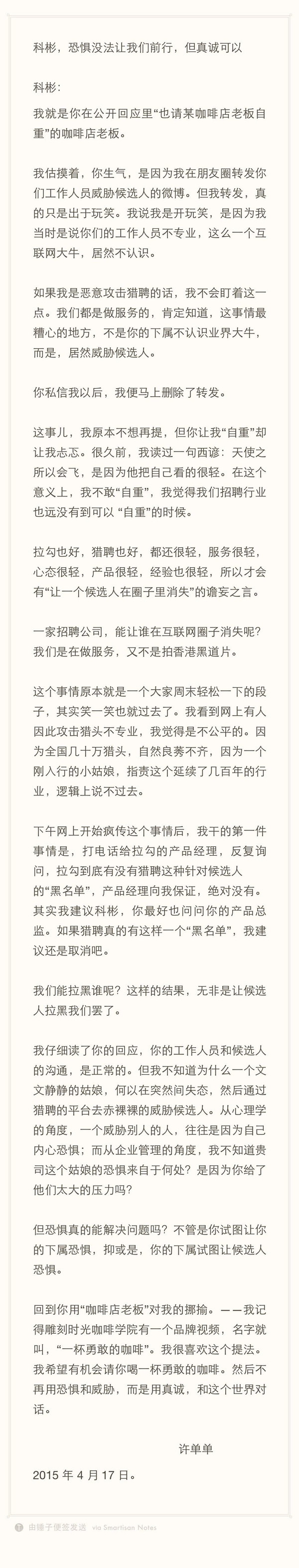 最后,我们来看看拉勾网的反应,来自拉勾网创始人,董事长许单单。