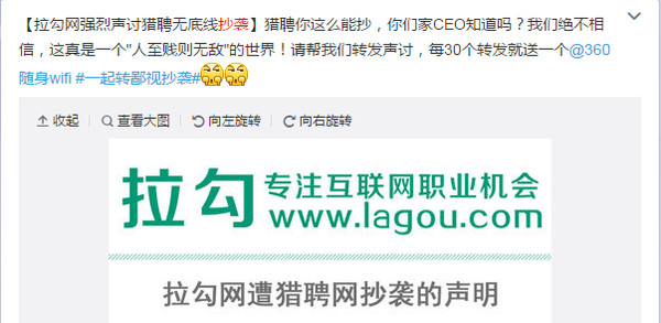今天下午,我正风骚地写着代码,打开朋友圈突然看到这样一条消息。由拉勾网CEO @马德龙 先生发出,看得出来态度比较义愤填膺,矛头直指猎聘网(两家存在竞争关系,这一点暂且不表)。