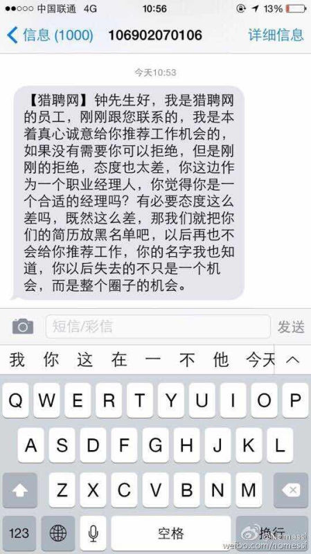 这时我才知道,原来是因为猎聘网的客服给钟先生打电话推荐工作机会,被钟先生快速回绝。客服觉得钟先生回绝态度恶劣(有可能正在和VC meeting呢),心有余气,于是通过猎聘网的系统账号给张先生发送了如上二图的消息,可能觉得说完第一段话还不够解气顺势又补了一刀,说出:“你连基本做人尊重人的道理都不懂,根本不配做一名合适的职业经理人,请自重”这样的重话。我觉得能给职业经理人介绍工作机会的客服,好带也是senior级别的客服吧?有什么不爽暗地里骂娘,默默拉黑不就完了,非要选取这么极端的方式毁掉自己的职业生涯。现在短信和微信类似以前邮箱的功能,可以用于留底,在这个互联网极其发达的时代,任何公开的言论都有可能给公司给自己带来灭顶之灾。